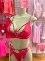 Set includes Bralette, garter belt and matching thong